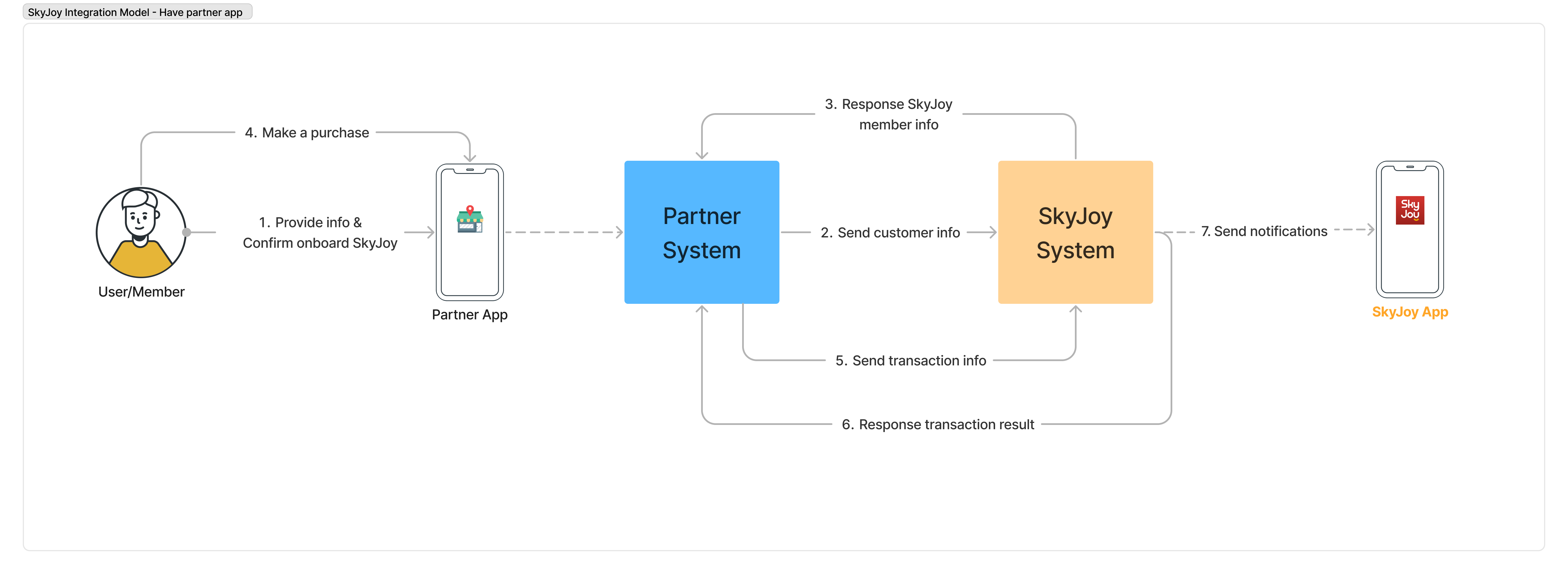 - Step 6: SkyJoy System processes points earning or redemption and responds with the results to your system; see transaction API.
